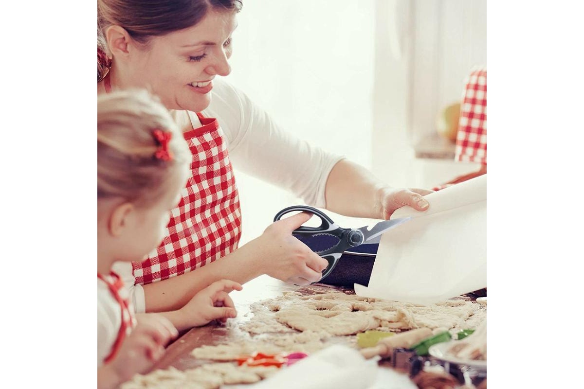 Our scissors are excellent for cutting turkey, large meats, bones, ribs, chicken wings, poultry, seafood, herbs, vegetables, and more. The innovative serrated blade design allows you to remove fish scales as well. Additional steel teeth located between the handles can open tightly sealed bottles, crack crab shells or nuts, and it even works as a bottle opener. Do not need chopping boards and choppers, bring kitchen work more convenience.